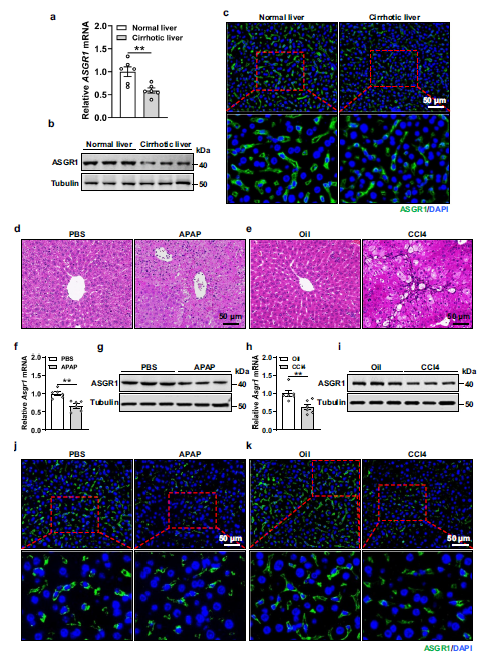 a、b 正常和肝硬化人肝組織中脫唾液酸糖蛋白受體 1 (ASGR1) 的相對 mRNA 和蛋白表達(每組 n = 6)。c 正常和肝硬化人肝組織中 ASGR1 的免疫熒光染色。d – k 8周齡小鼠腹腔注射對乙酰氨基酚(APAP,400 mg/kg體重,單劑量)以誘導急性肝損傷,PBS作為對照治療,或四氯化碳(CCl4,1 ml/kg)身體體重,每周兩次,持續(xù) 6 周),以油作為對照治療誘導慢性肝損傷(每組 n = 6)。d、e 肝切片的 H&E 染色。f – i 用 APAP 或 CCl4 處理的小鼠中肝臟 ASGR1 的相對 mRNA 和蛋白質表達。j、k 用 APAP 或 CCl4 處理的小鼠肝臟中ASGR1 的代表性免疫熒光染色。