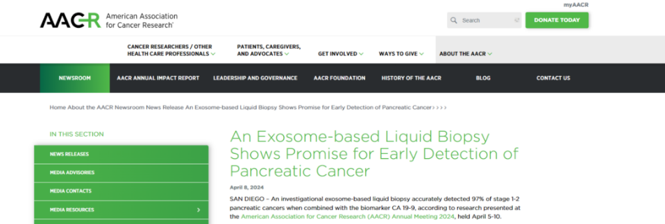 根據(jù)2024美國癌癥研究協(xié)會(AACR)年會上發(fā)表的一項研究,在結(jié)合生物標(biāo)志物CA 19-9的情況下,基于外泌體的液體活檢可準(zhǔn)確檢測出97%的Ⅰ~Ⅱ期胰腺癌。