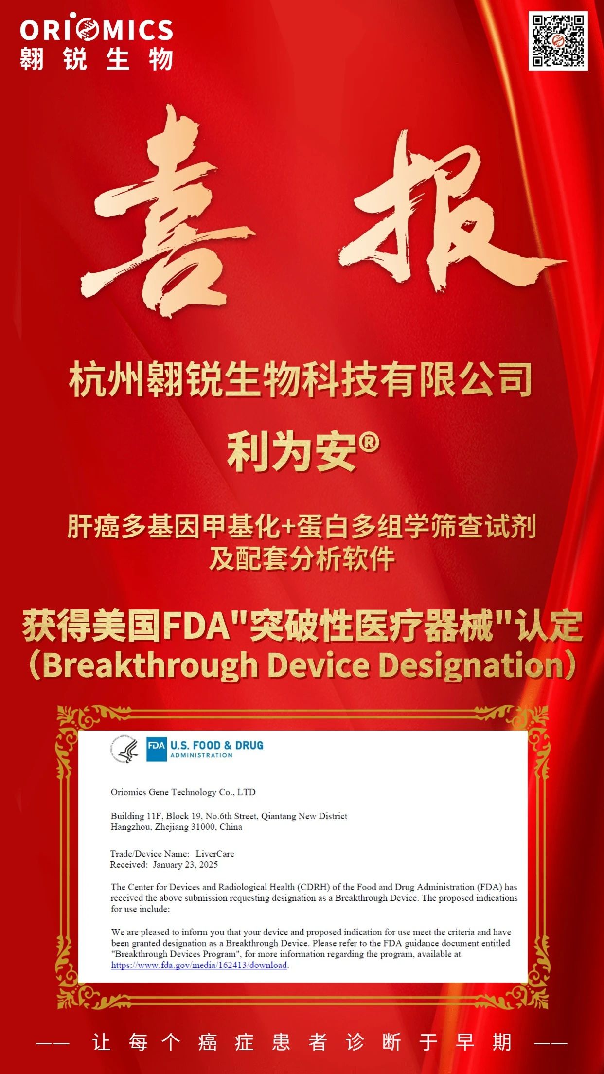 2025年3月21日,熱景生物參股企業翱銳生物旗下早篩產品利為安?——肝癌多基因甲基化+蛋白多組學篩查試劑及配套分析軟件獲得美國食品藥品管理局(FDA)“突破性醫療器械”(Breakthrough Device Designation)認定。