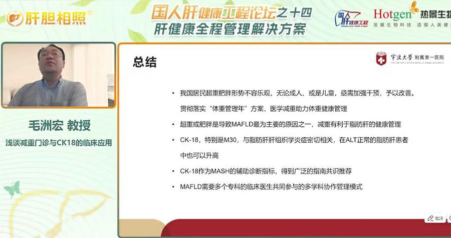 寧波大學(xué)附屬第一醫(yī)院內(nèi)分泌科毛洲宏教授在會議上圍繞“減重門診與CK18的臨床應(yīng)用”作專題報(bào)告,強(qiáng)調(diào)國家衛(wèi)健委“體重管理年”政策推動下,醫(yī)療機(jī)構(gòu)需加強(qiáng)減重門診建設(shè),為超重及肥胖人群提供專業(yè)化服務(wù)。毛教授也以本院“肥胖俱樂部”在開設(shè)近十年的真實(shí)經(jīng)驗(yàn),給我們科普了減重管理的重要性。目前,我國超重肥胖形勢嚴(yán)峻,超50%成人存在體重異常,肥胖與代謝相關(guān)脂肪性肝病(MAFLD)密切相關(guān),約20% MAFLD患者可能進(jìn)展為脂肪性肝炎(MASH),T2DM患者合并MAFLD比例高達(dá)65.04%。毛教授指出,傳統(tǒng)檢測手段如ALT、B超在早期診斷MASH及纖維化中存在局限性,而細(xì)胞角蛋白18(CK-18)片段作為新型生物標(biāo)志物,通過M30/M65片段可無創(chuàng)評估肝細(xì)胞凋亡與壞死,其敏感性與特異性顯著優(yōu)于傳統(tǒng)指標(biāo)。此外,MAFLD需多學(xué)科協(xié)作管理,結(jié)合減重、改善代謝、抗纖維化等綜合干預(yù)措施,定期監(jiān)測高危人群。毛教授總結(jié)稱,CK18的應(yīng)用將推動MAFLD精準(zhǔn)診療,而政策支持與多學(xué)科模式普及,為肥胖及相關(guān)代謝疾病防控注入新動力。