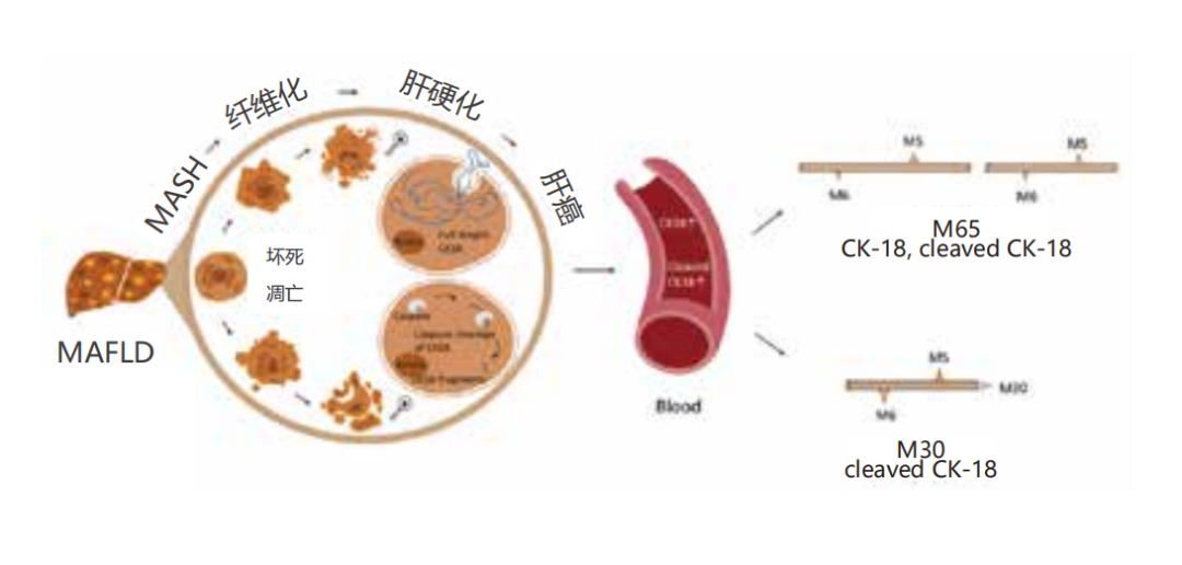 細胞角蛋白18(CK-18)是肝細胞及其他上皮細胞主要的細胞骨架蛋白。CK-18可以由死亡的細胞釋放入血清,因此可以作為細胞壞死信號。血清中存在兩種形式的CK-18,即總CK-18蛋白(CK18-M65)和半胱氨酸裂解的CK-18片段(CK18-M30)。CK18-M65被用來評估總肝細胞死亡,而CK18-M30用于特異性評估肝細胞凋亡。